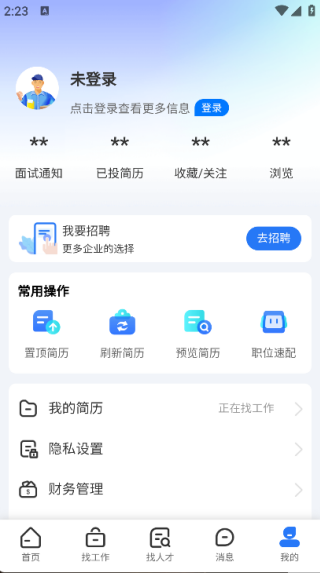 4. 点击页面下方的‘我的’,即可看到置顶简历、隐私设置、财务管理等功能。